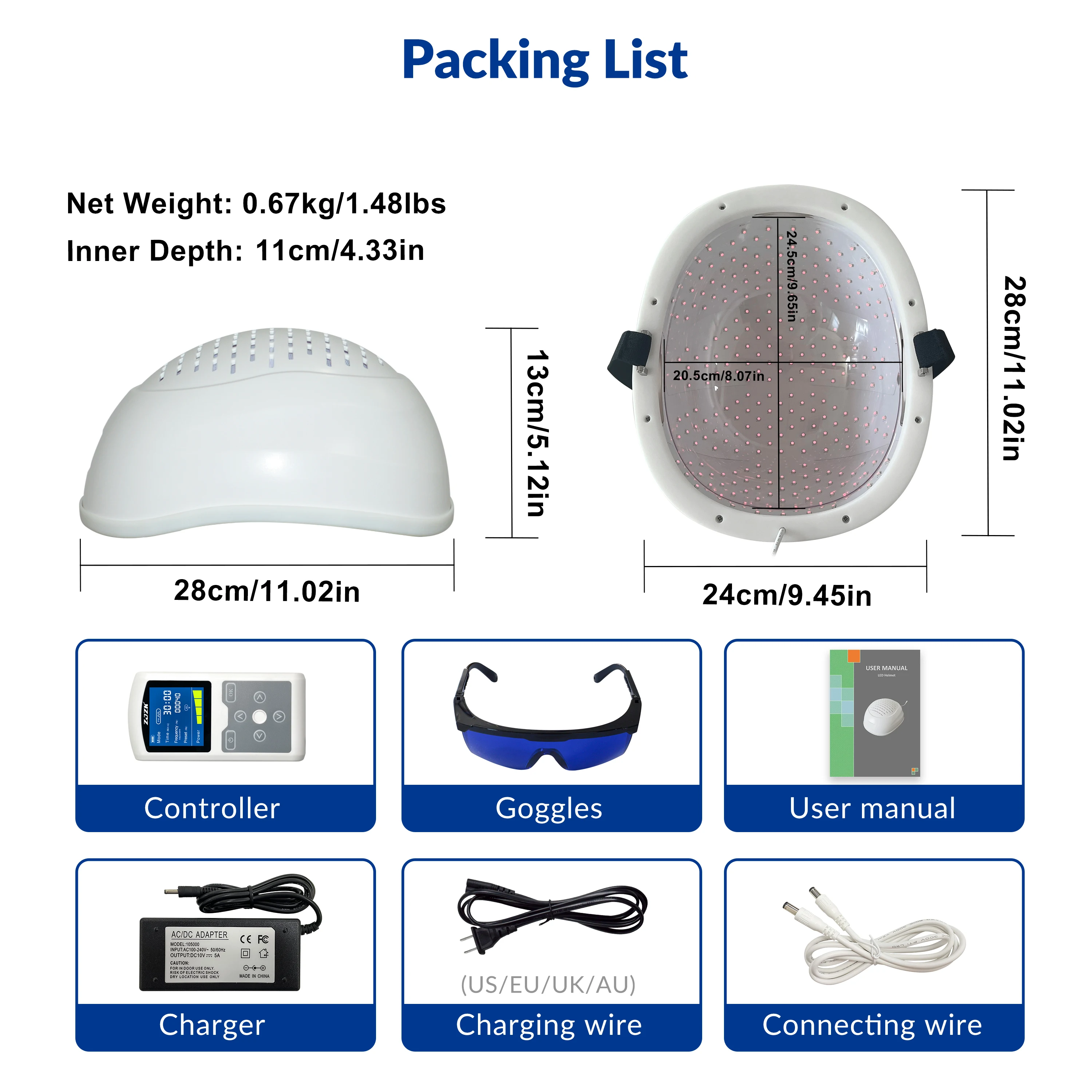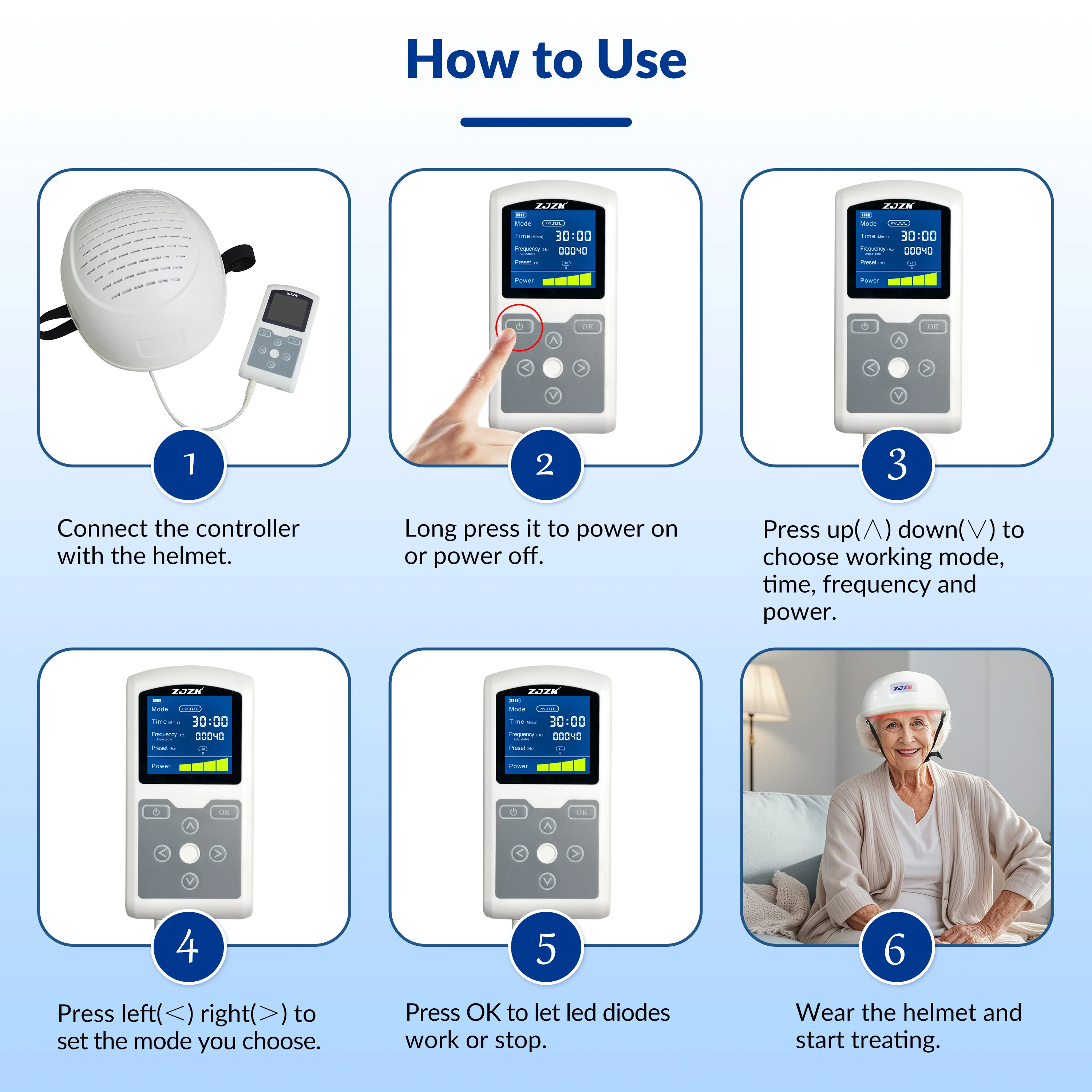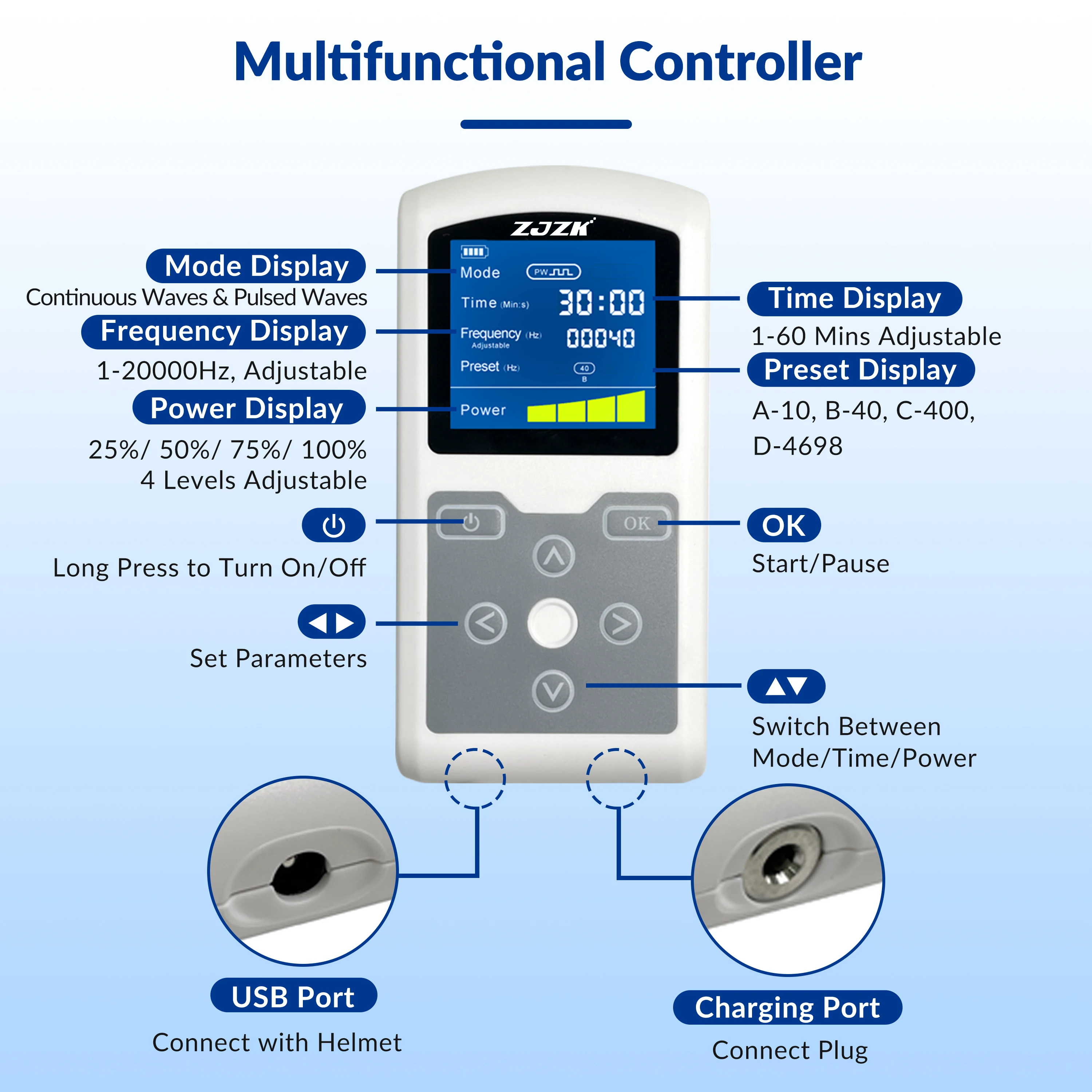 【brain light therapy】This brain therapy device includes 1 pbmt infrared helmet, 1 controller, 1 goggles, 1 charger, 1 charging cable, 1 connecting cable, 1 aluminum carrying case, and 1 user manual. It is recommended to use the helmet twice a day, each time for 20-30 minutes. The brain stimulation device emits infrared radiation deep into the brain, stimulating mitochondria to produce chemical energy and providing energy for biochemical reactions in brain cells.